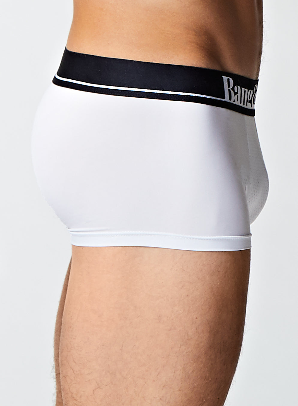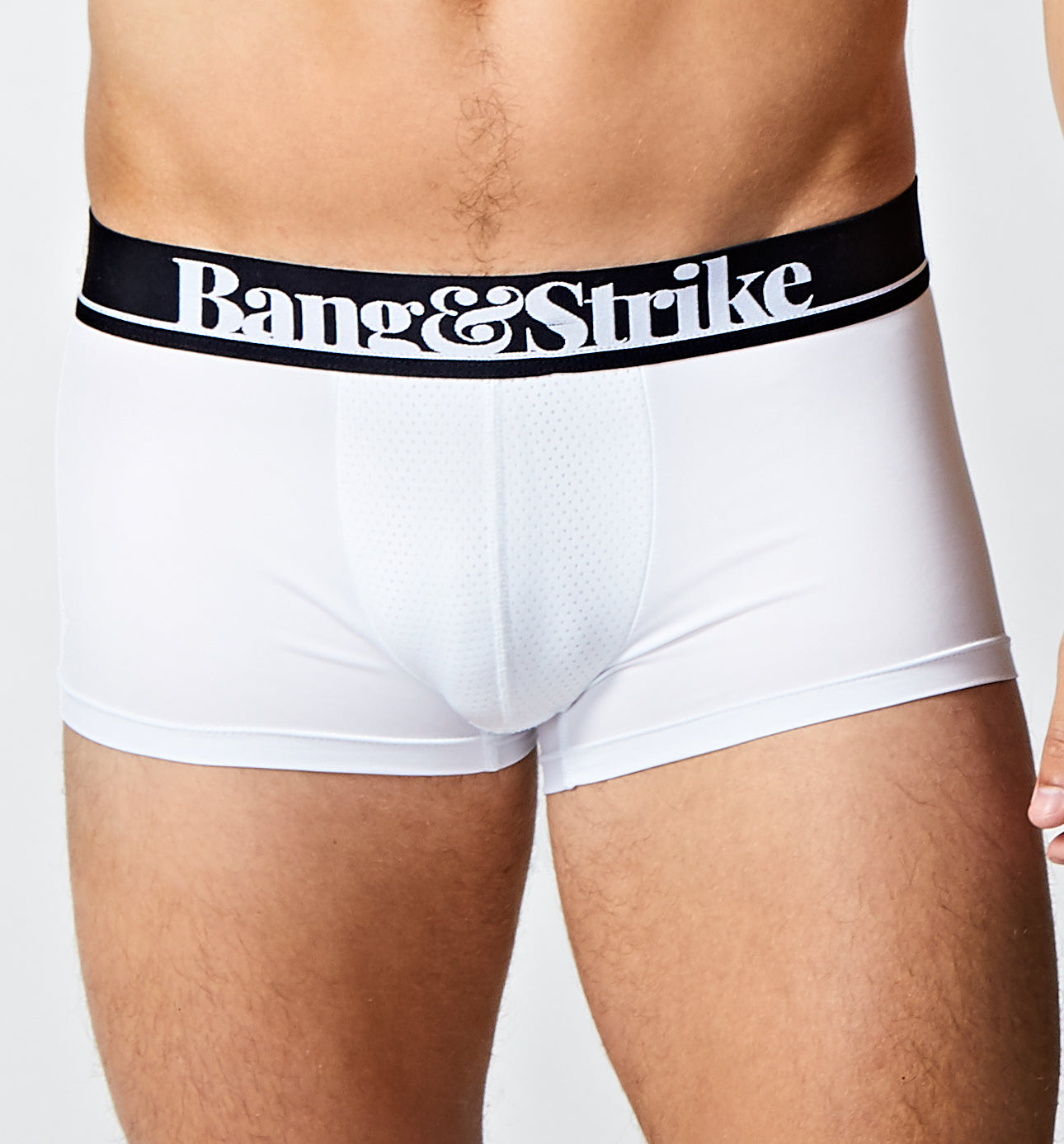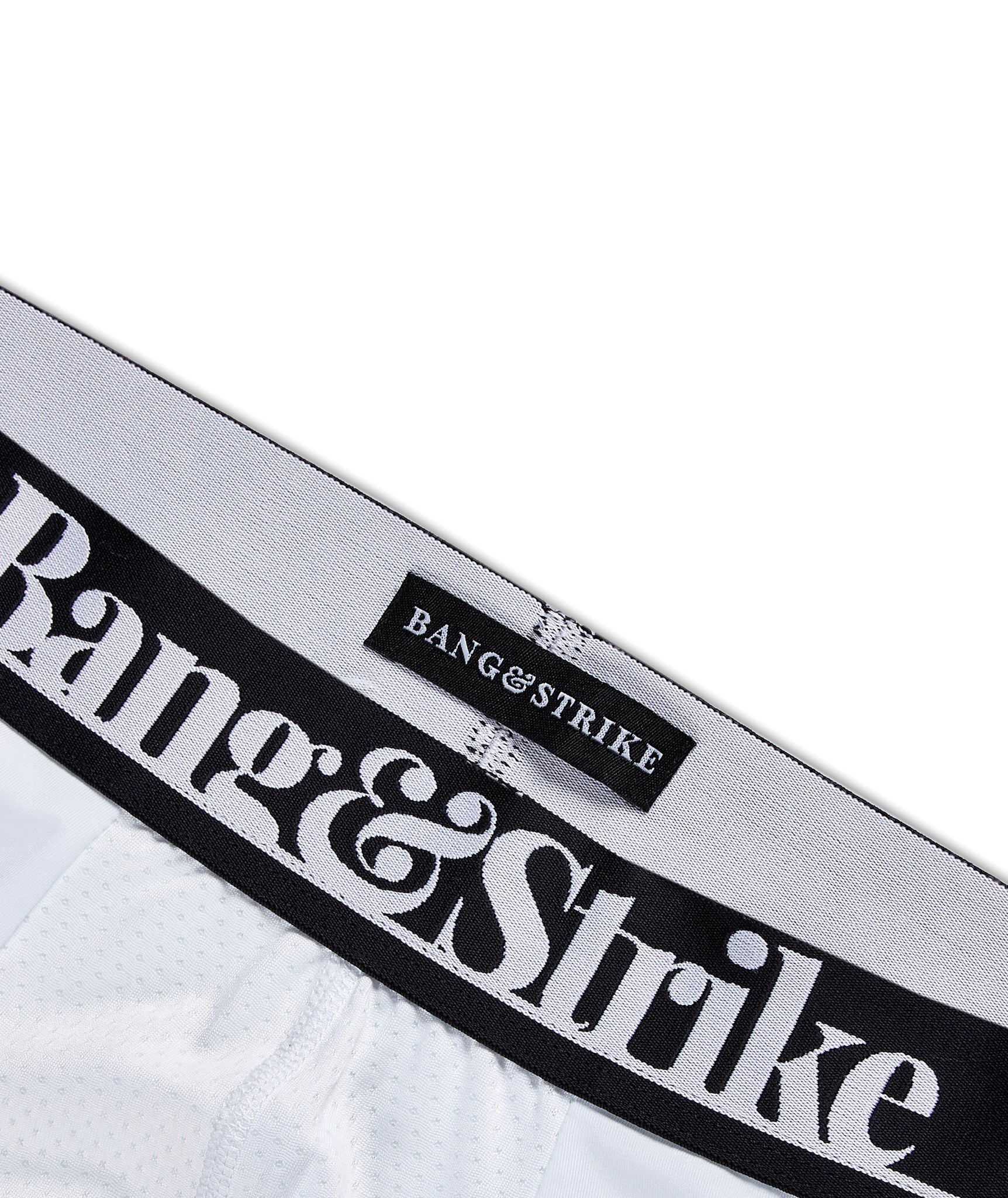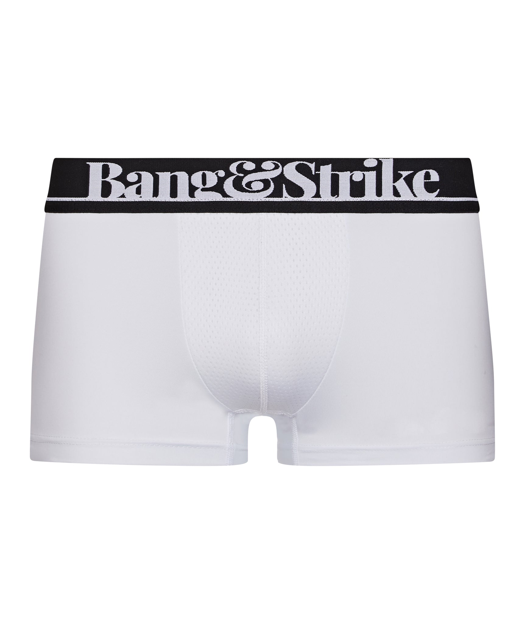 The white FLEX Sports Trunk is a performance sport trunk made from a high quality stretch microfibre that is both lightweight and moisture wicking for a 'keep dry' sensation and all day comfort. A twin ply, micro mesh pouch sits below a 4cm thick elasticated waistband with contrast BANG&STRIKE branding and lower edge stripe.