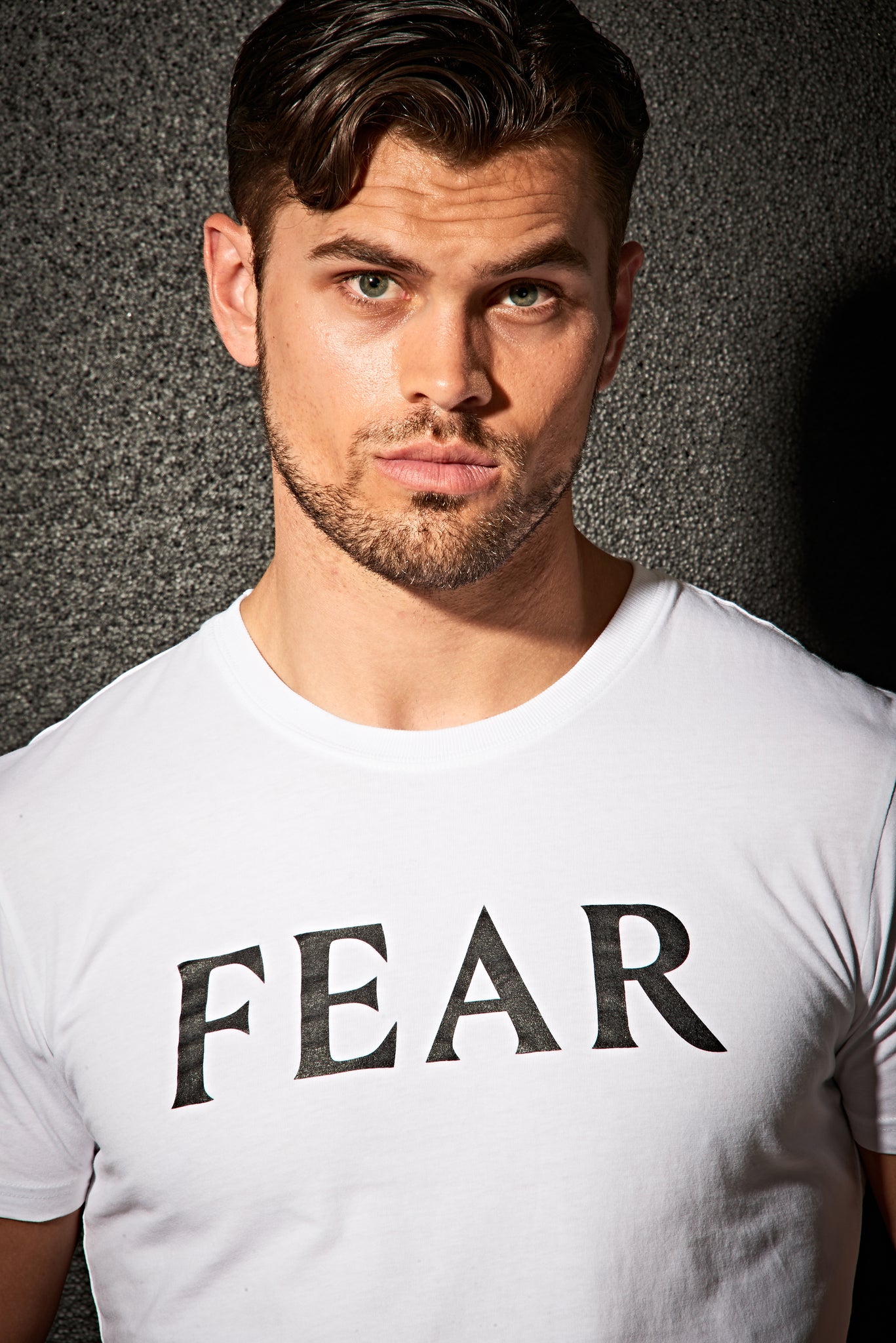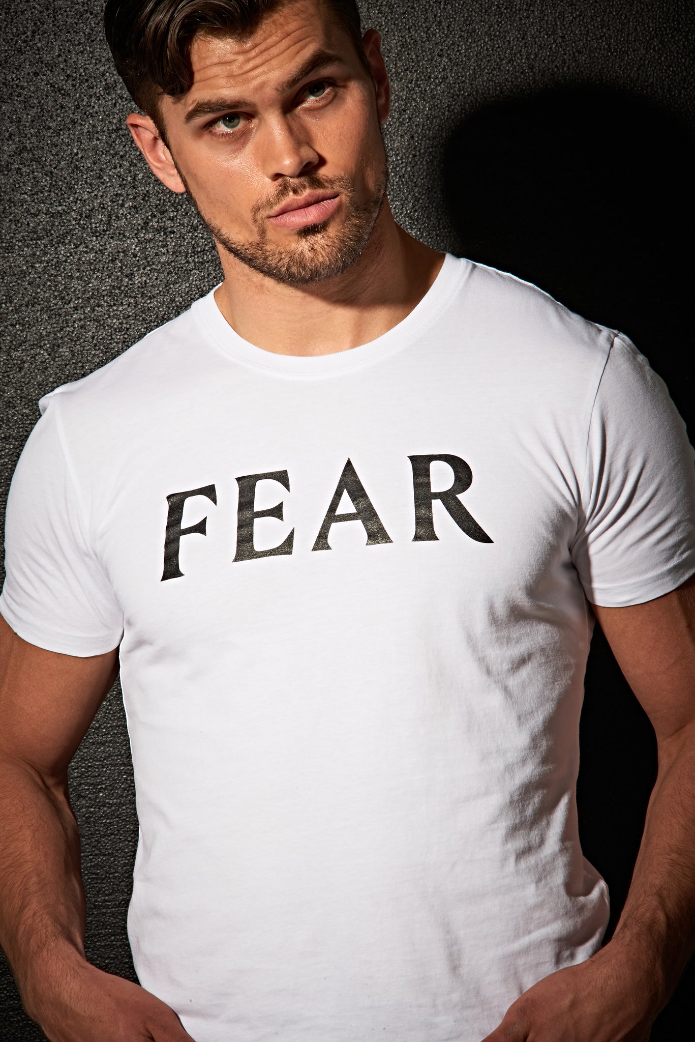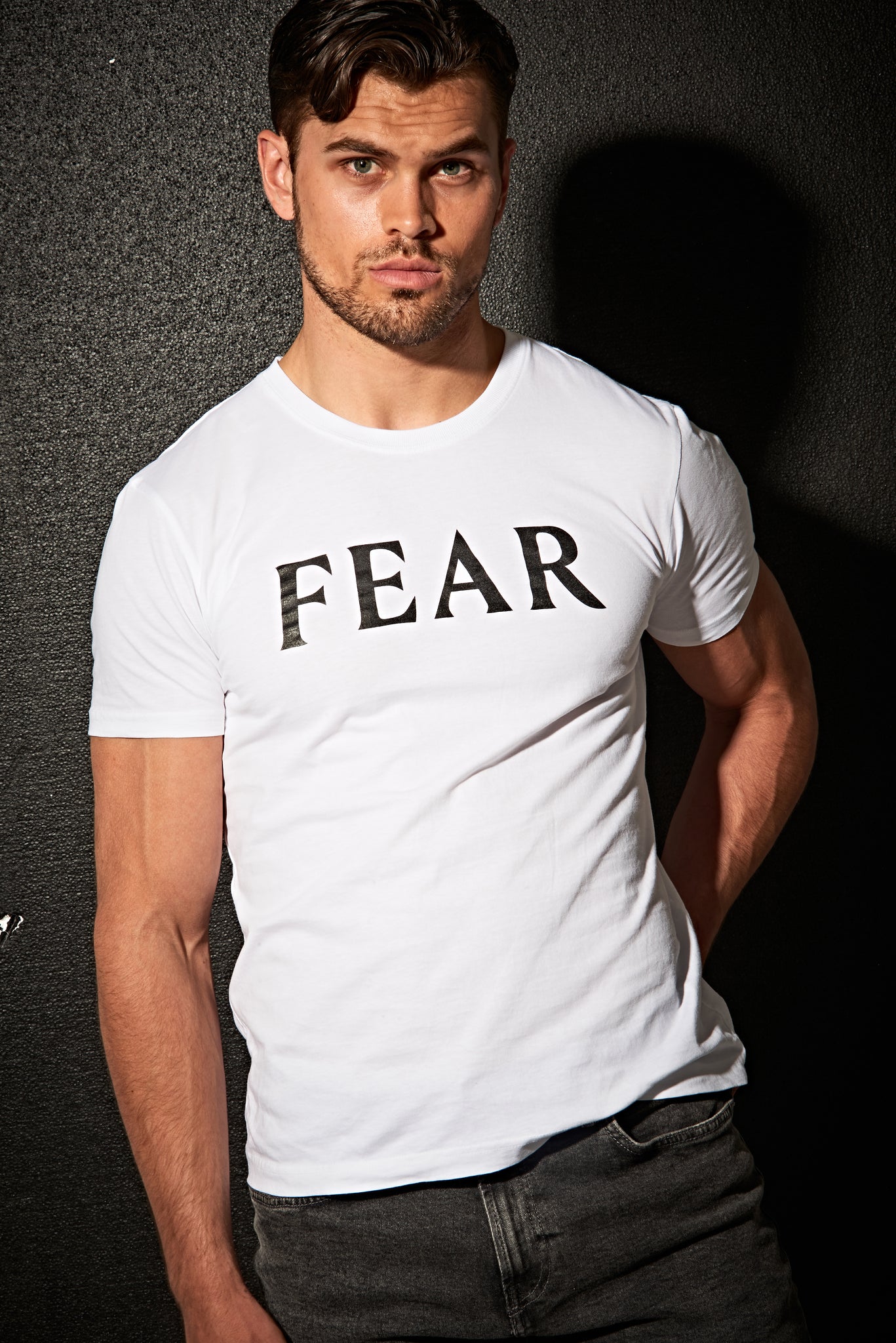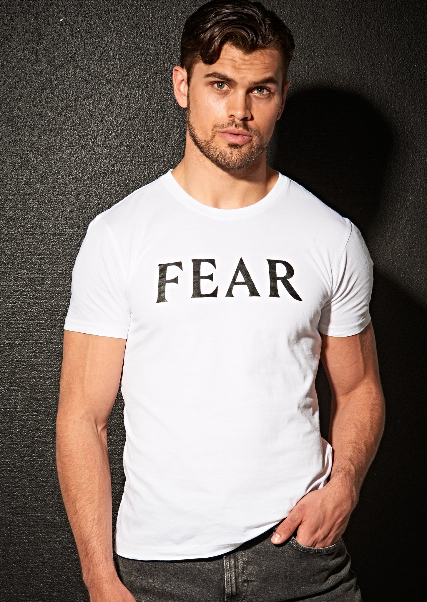 Our FEAR athletic fit men's t-shirt is made from a lightweight 100% organic cotton with fitted sleeves and body. The t-shirt features a contrasting FEAR logo on the chest, a crew neck and twin needle hem