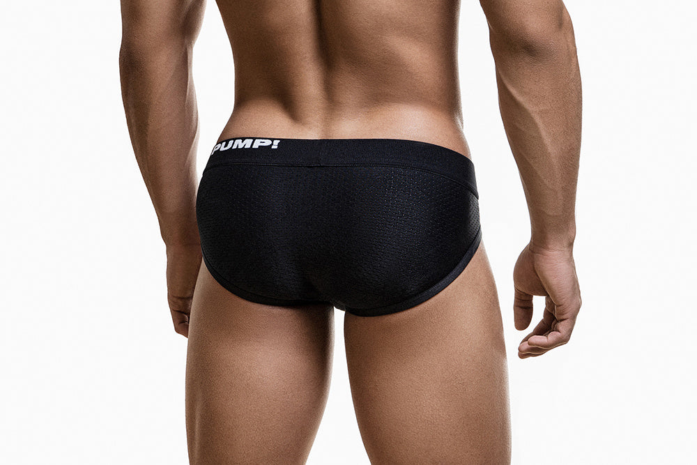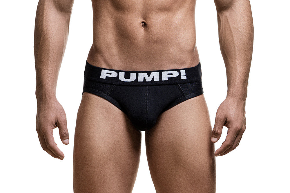 The PUMP! Classic Black Brief features a soft stretch cotton pouch and a black sports mesh body with a 40mm wide waistband with strong contrast branding. The fit is low rise with a fully contoured supportive pouch.