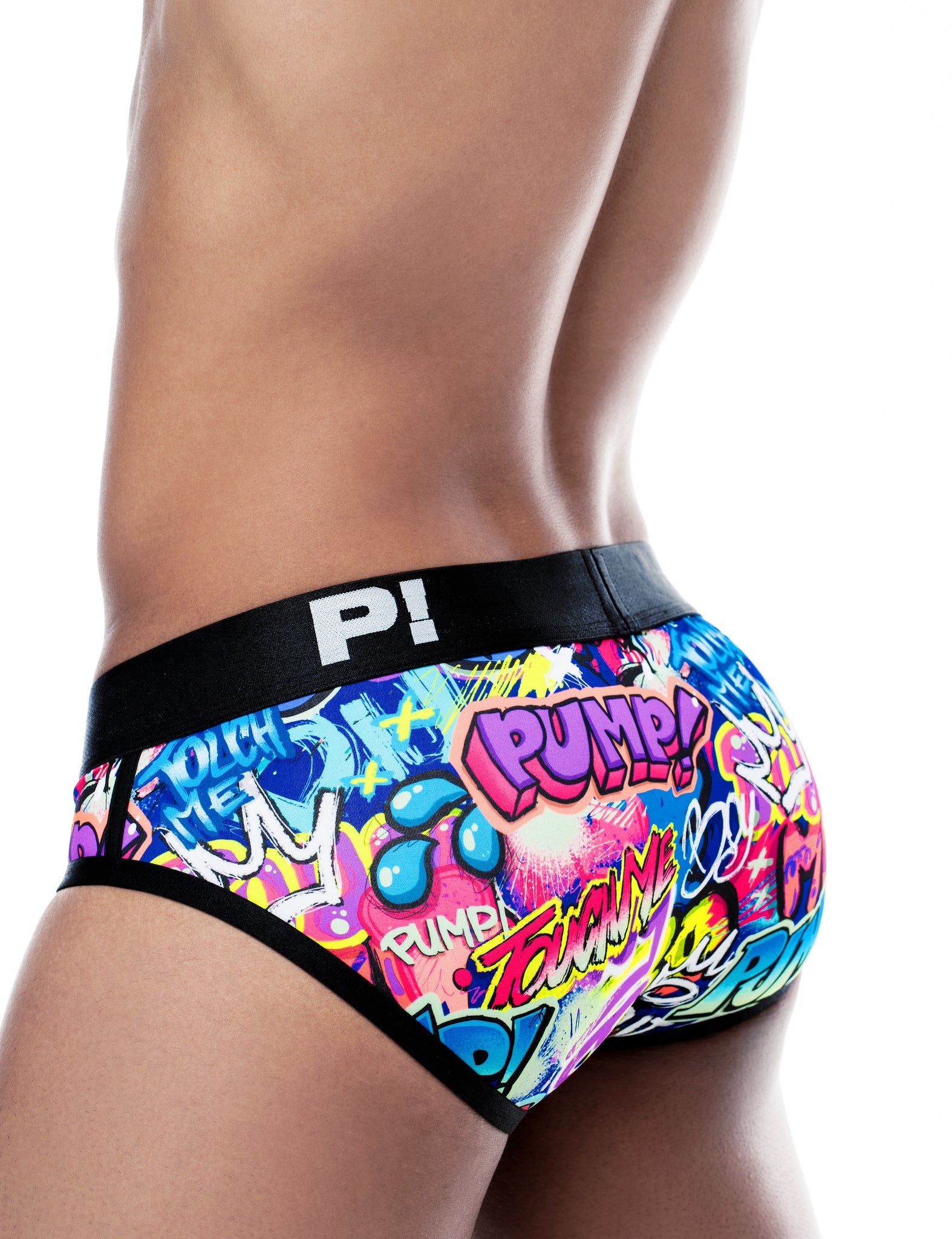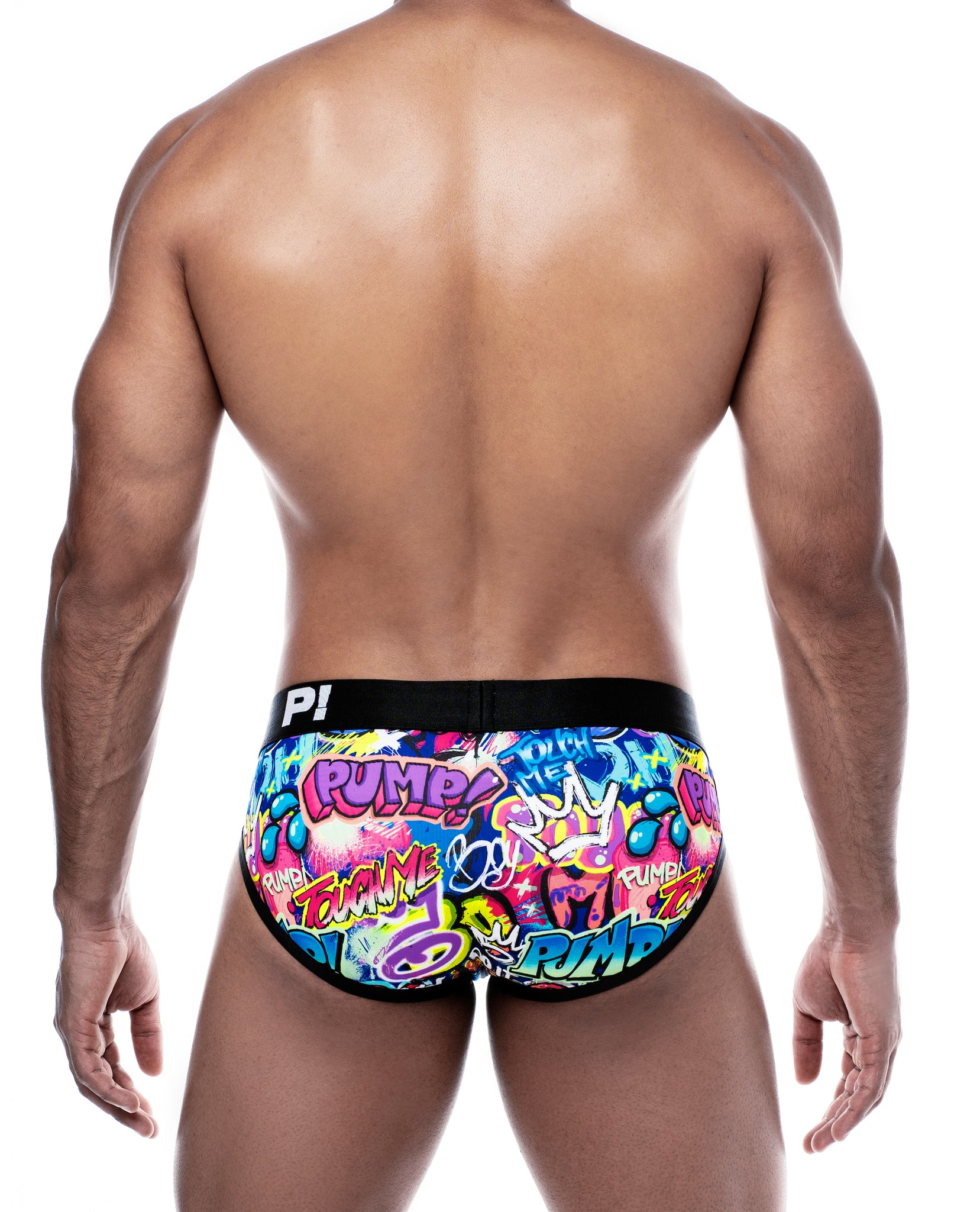 The PUMP! DRIP Graffiti Print Brief is made from moisture-wicking and durable microfibre that features an all-over graffiti print, with the placement of the print varying on every pair. The 4cm wide elastic waistband features white PUMP! branding centre front on a black base with black bindings.