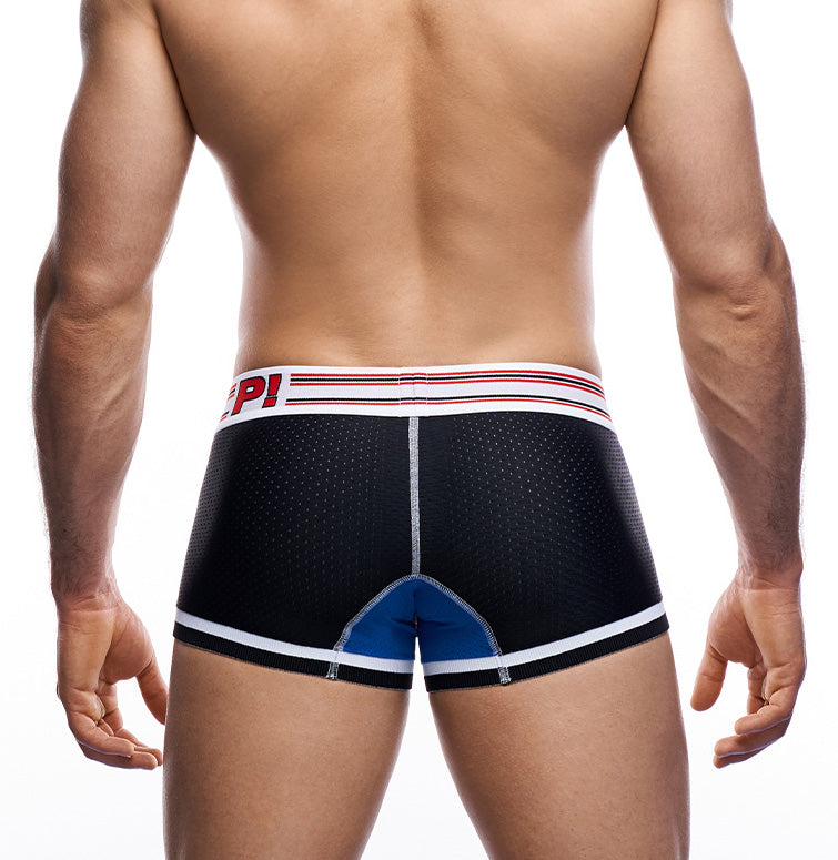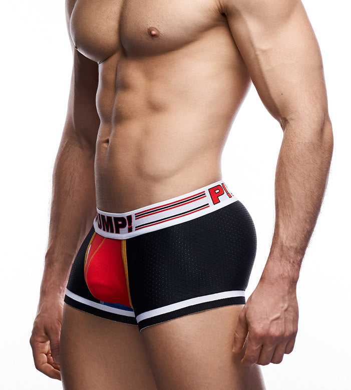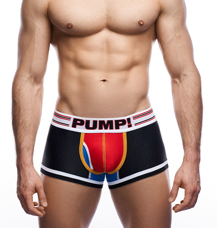 The PUMP! E-Racer Circuit TouchDown Trunk has a full mesh black body with a soft red and blue cotton pouch. Part of the E-Racer series with sports-inspired detailing and a 45mm wide branded elastic waistband in black, red and white, featuring electric blue mesh crotch detail and ochre contrast binding.