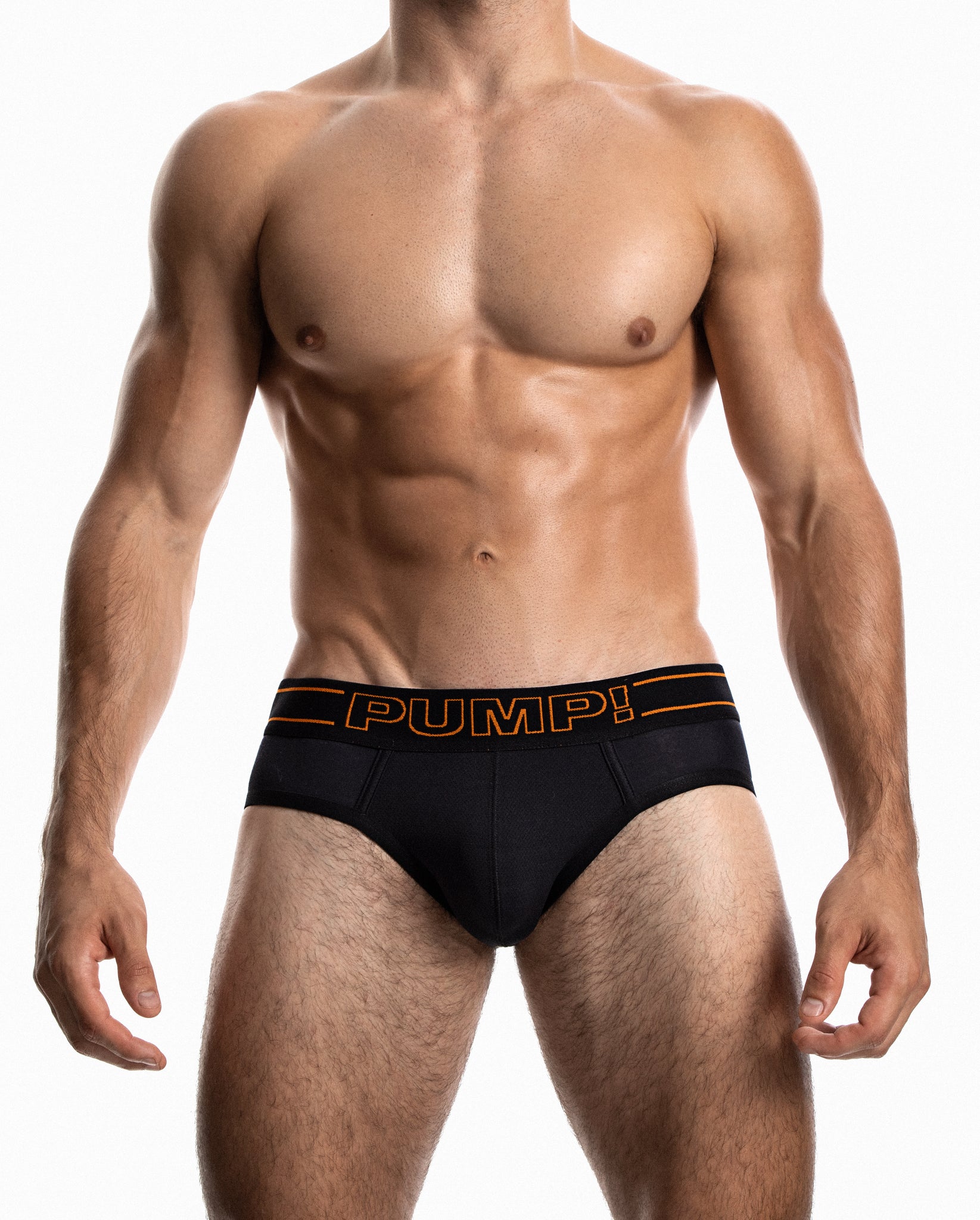 The PUMP! NightLight Brief is made from soft stretch cotton with a micro mesh pouch in black with orange highlights and detailing. The 4.5cm wide elastic waistband features strong PUMP! Underwear branding centre front and upper and lower stripe detailing.