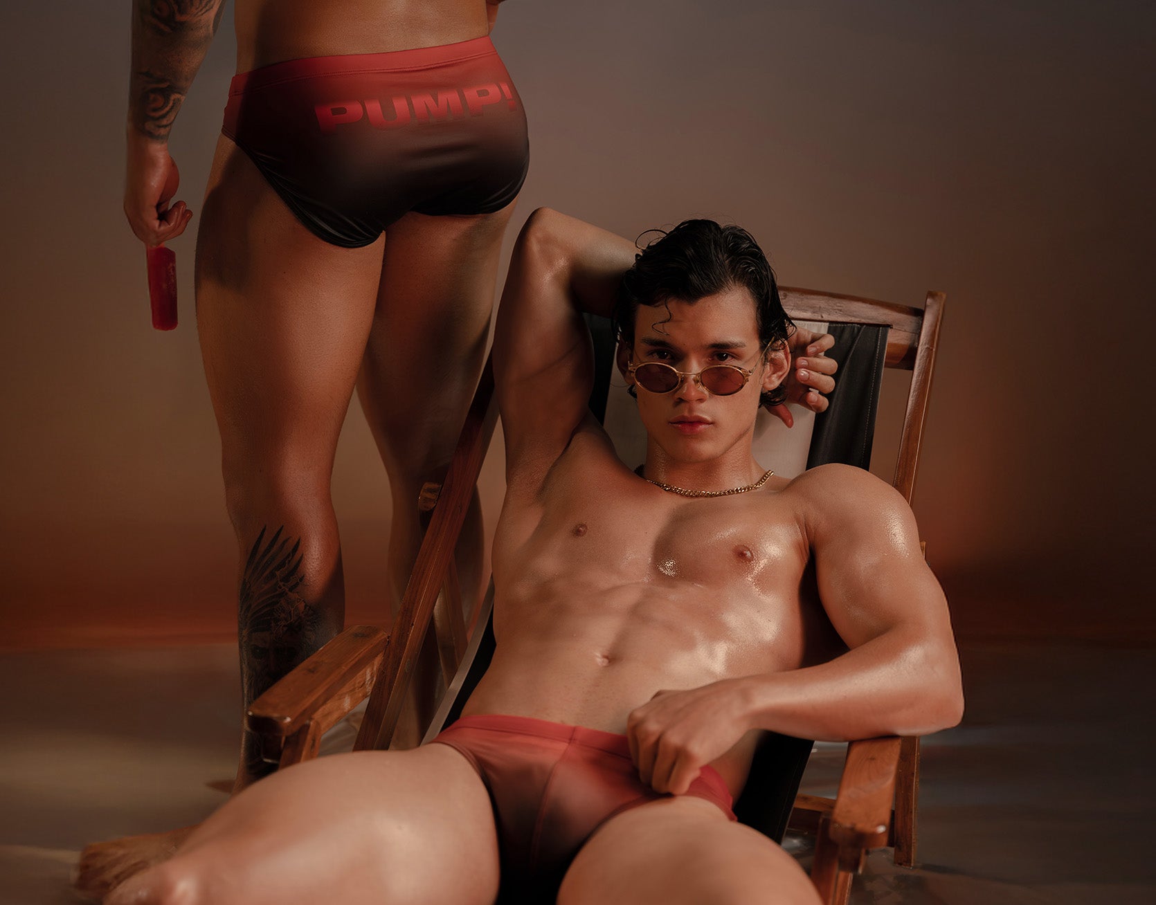 The PUMP! NIGHTFALL Suncity Swim Brief is new for Summer 2026 and features a red to black gradient print on a sports cut swim trunk with a fully contoured pouch for that perfect fit. A covered soft elastic waistband and PUMP! branding printed across the back, with UPF 50+ protective fabric, soft microfibre lining and a low cut design.