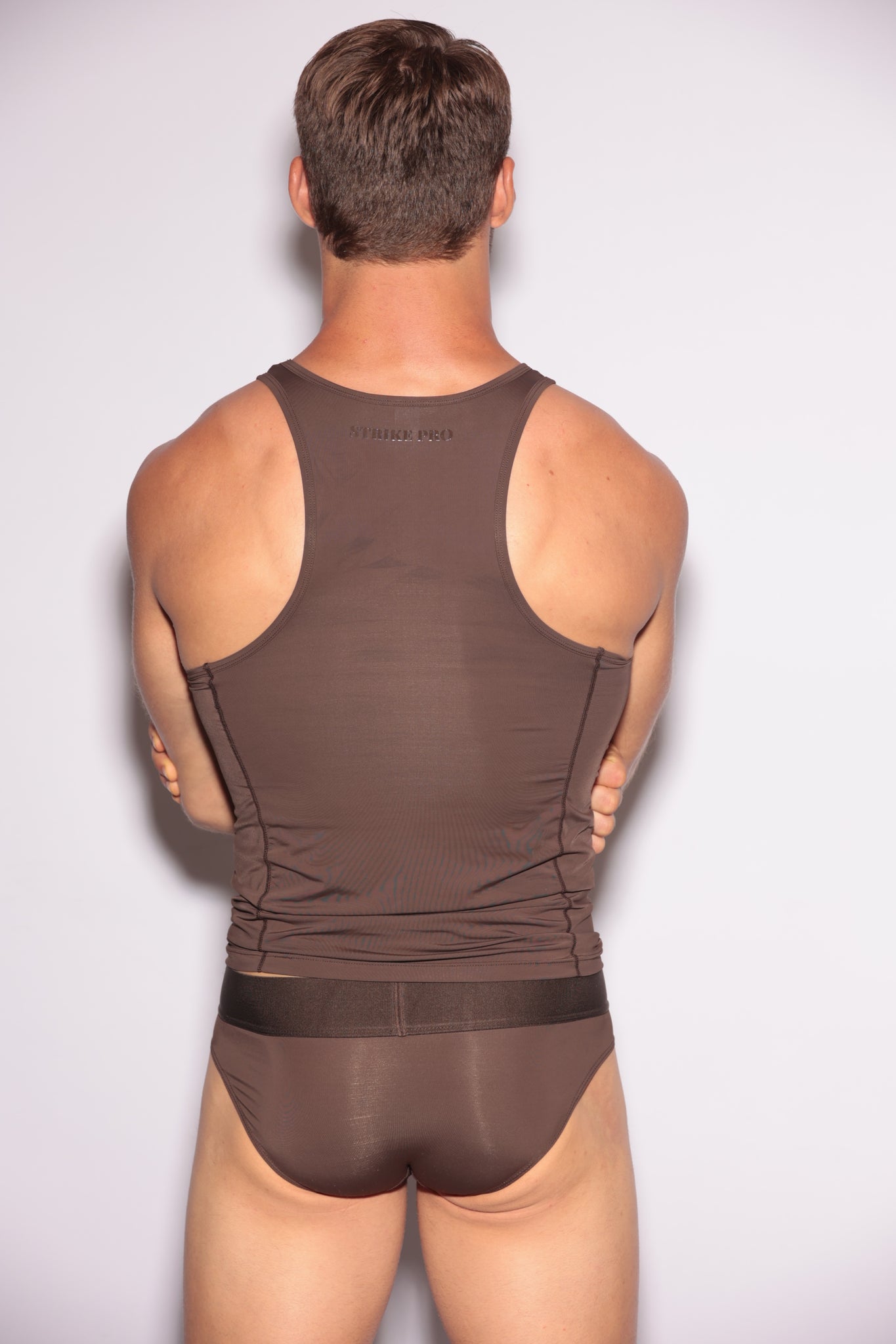 STRIKE PRO Terra Men's Sports Tank - a high stretch, silky soft and lightweight sports tank with a racer neck back and scoop front. Discreet tonal silicone print branding on the back neck. With flat lock, soft touch seams throughout and removable paper care label for maximum comfort
