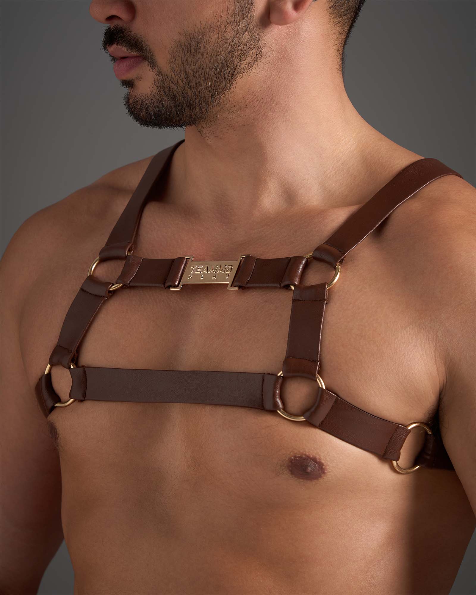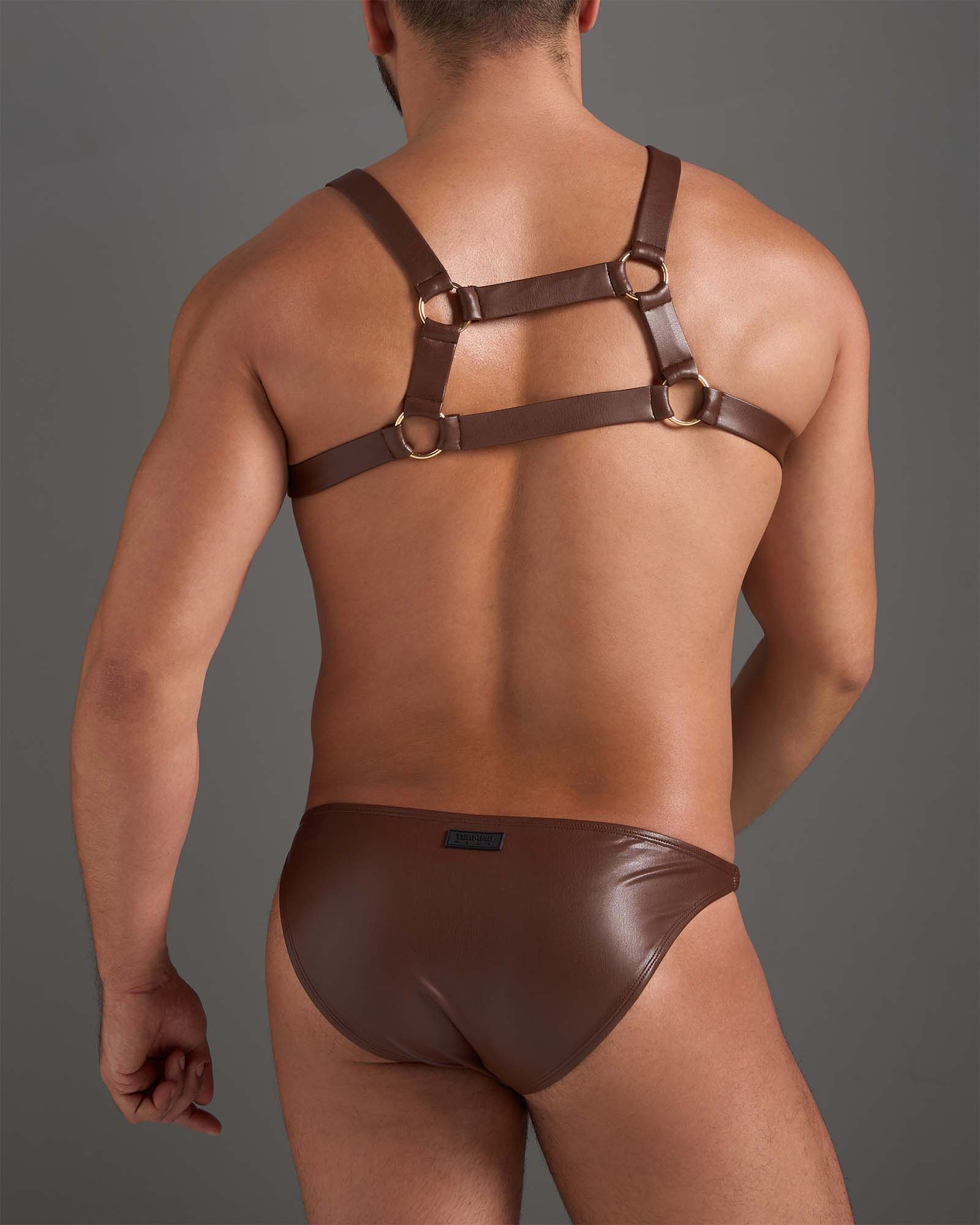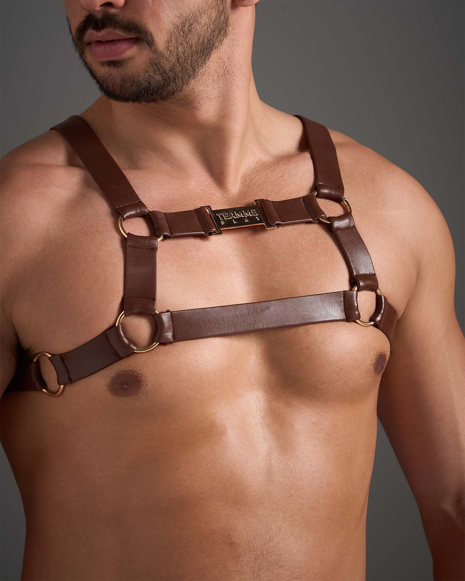 TEAMM8 FLEX FAUX LEATHER SADDLE BROWN HARNESS - a stretch fit faux leather harness with quality metal hardware.FLEX is a high voltage, range of underwear for play from Australian brand TEAMM8 made from vegan PU leather with gold coloured metal hardware featuring TEAAM8 branding on the chest and we also have a matching jockstrap and brief