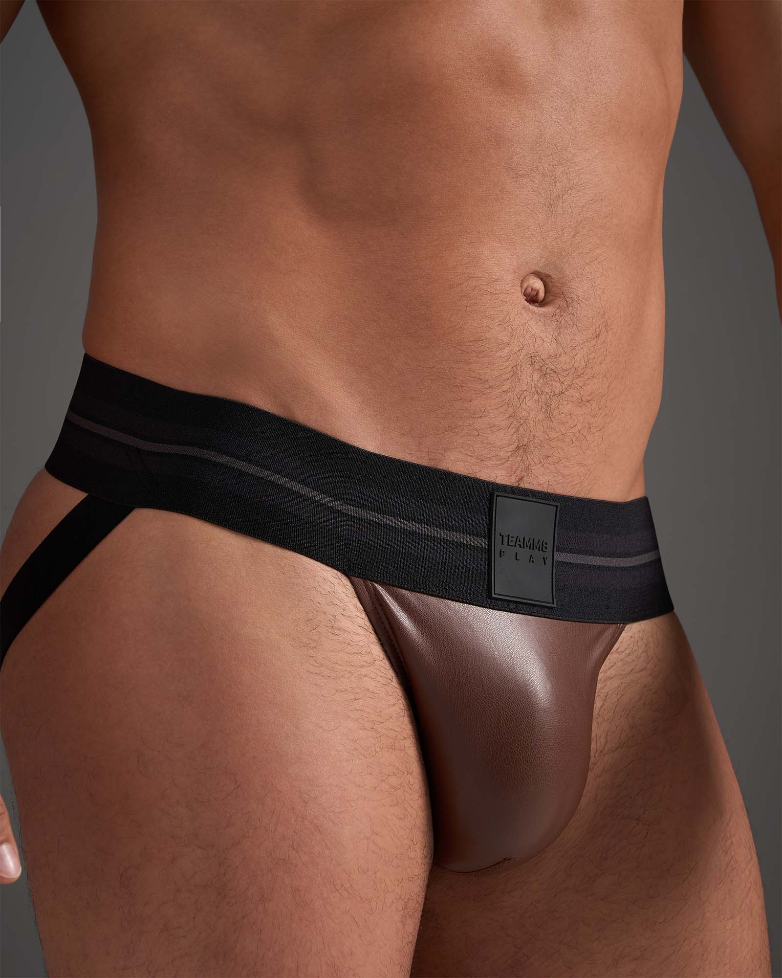 TEAMM8 FLEX FAUX LEATHER JOCKSTRAP - a high voltage, range of underwear for play from Australian brand TEAMM8 made from brown vegan leather and mock python skin with a wide black tonal stripe waistband and also available a matching brief and harness